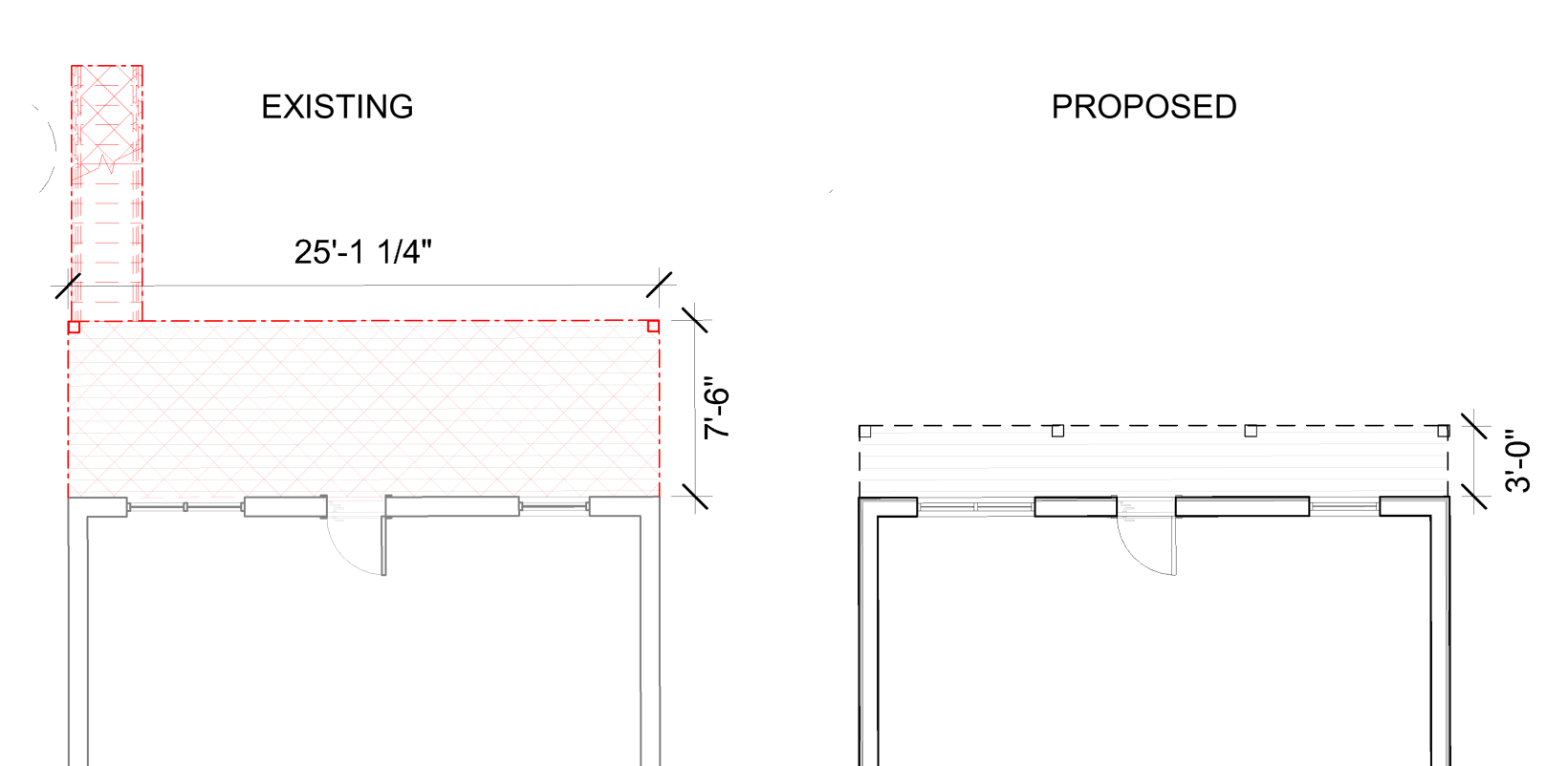 The existing 7′-6″ rear deck and perpendicular stair made it difficult to meet the required 16′ clearance to the laneway house. Keeping the deck would have forced a long, narrow building footprint, which the owner did not want. We decided to reduce the deck to 3′ to provide adequate space and allow for a more comfortable laneway house form.