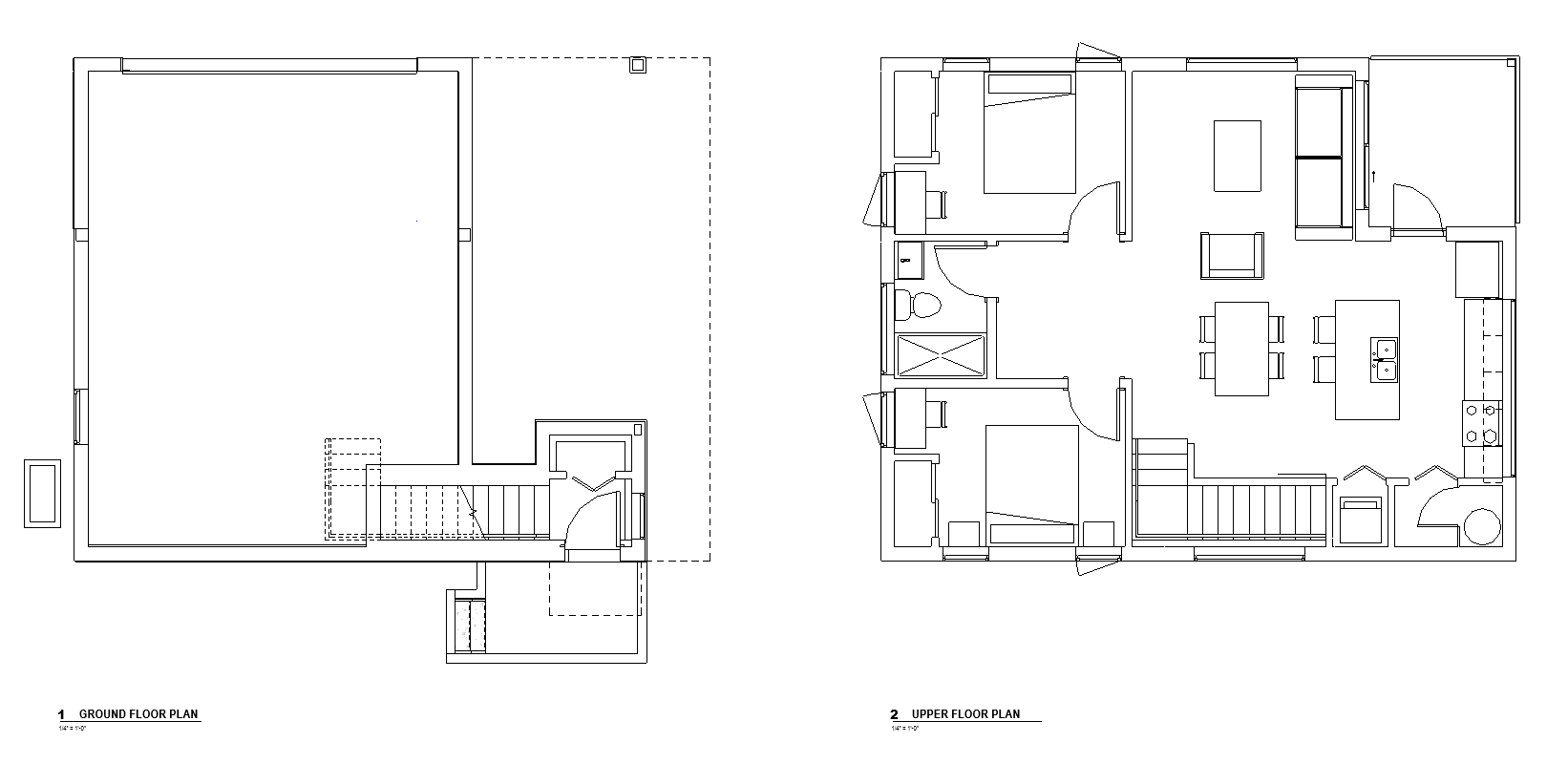 Two bedrooms, one bath, and an open living plan are arranged to minimize wasted circulation. The plan prioritizes sightlines, ceiling height, and daylight over excess rooms, resulting in a home that feels calm and spacious despite its compact footprint.